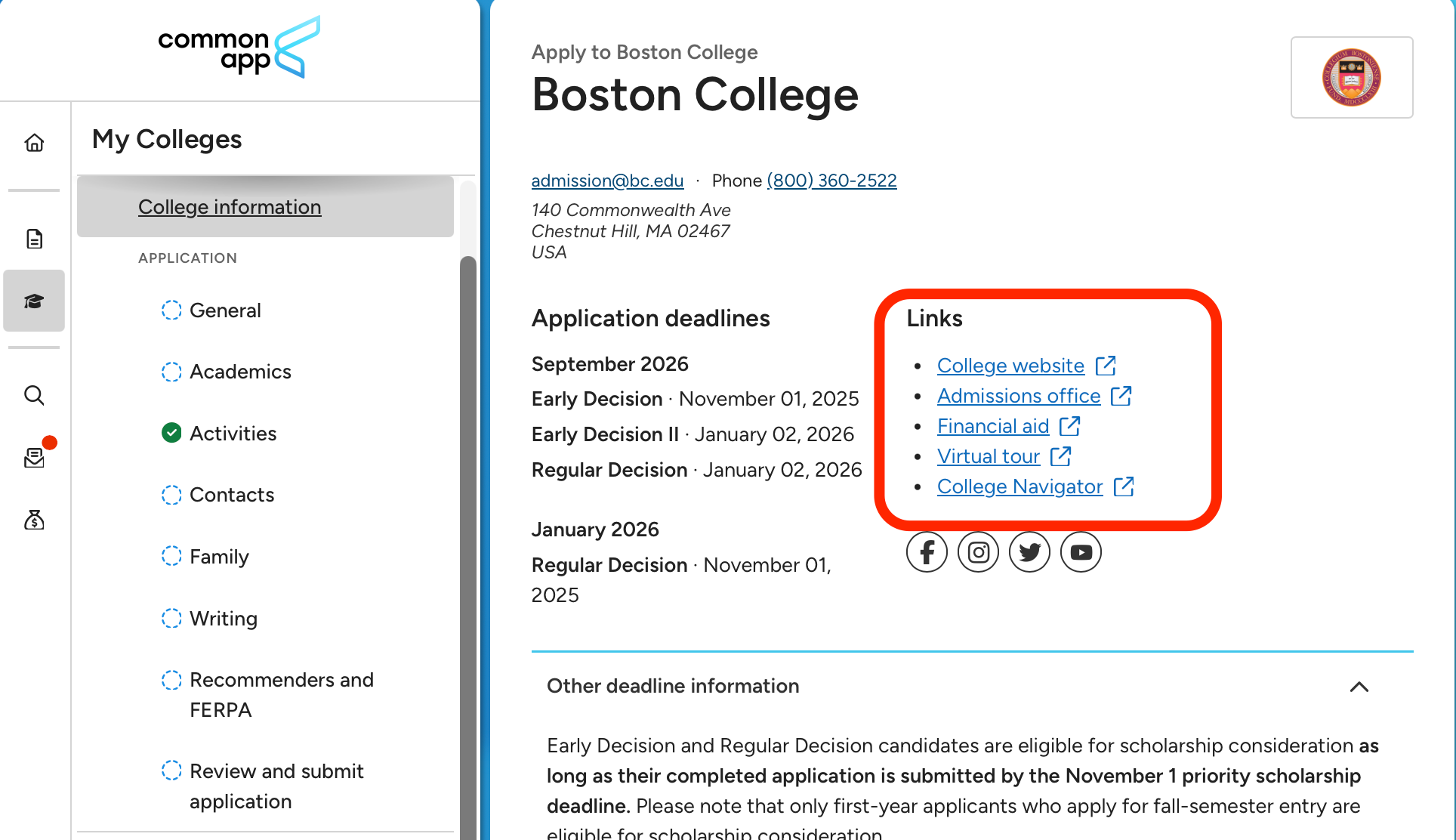 Second, you can begin to use the robust information provided about specific colleges in the Explore sections in the College Search tab to explore and low-key research the specific academic and extracurricular life at each school of your choice. Note that adding a college to your CommonApp in NO WAY obligates you to apply—it just gives you the OPTION to apply if and when the time comes. When you “Add” a college, you gain access to five great links to highly useful information about that particular school, all within the framework of the CommonApp—College Website, Admissions Office, Financial Aid, Virtual Tour, and College Navigator—as well as all the specific supplement items that colleges ask for , including possible essay questions (Note these items and essay prompts may change on August 1 each year, in theory, but they rarely do, and when they do it’s usually not by much.) Again, no pressure to study for an exam or write a single word. You’re just playing a video game and gaining familiarity at this point!