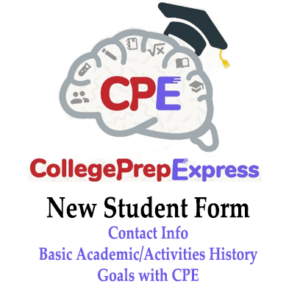 New Student Form: Contact Information, Basic HS Academic/Activities Record, and Goals For us to help you get the very best results in school and in the college admissions game, please provide as much information as possible! Your Contact DetailsLast Name *First Name *Street Address *City *State *ZIP *Student's Email *Student's Cell Phone *Home Phone *Name of Parent/Guardian 1 *Email of Parent/Guardian 1 *Name of Parent/Guardian 2 Email of Parent/Guardian 2 Academic InformationYour current school *Year of Graduation *202520262027202820292030203120322033Current GPA (approx): *9th Grade AP & Honors Classes taken or planned (with AP exam score in parentheses where applicable) 10th Grade AP & Honors Classes taken or planned (with AP exam score in parentheses where applicable) 11th Grade AP & Honors Classes taken or planned (with AP exam score in parentheses where applicable) 12th Grade AP & Honors Classes taken or planned (with AP exam score in parentheses where applicable) Top 2 to 4 Extracurricular Activities Based on time commitment and importance to you, including sports, clubs, community service, hobbies, jobs, and other passions. Your Goals With CollegePrepExpressHow did you hear about us? *Another CPE student (Please tell us who, in next box!)Social mediaOther (please specify in next box)Name of person/media who referred you What do you hope to achieve at CPE (e.g., Grades, Scores, Apps)? Do you know about our summertime CommonApp Boot Camps for rising seniors? Previous Test ResultsPSAT (please give Reading and Math scoress):Date of most recent PSAT Click any date in the correct monthPSAT Score SAT (note enter TWO scores for each, one Reading and one Math)Date of SAT #1 Click any date in the correct monthTotal SAT Score #1 SAT #1 Reading & Writing SAT #1 Math Date of SAT #2 Click any date in the correct monthTotal SAT Score #2 SAT #2 Reading & Writing SAT #2 Math Date of SAT #3 Click any date in the correct monthTotal SAT Score #3 SAT #3 Reading & Writing SAT #3 Math ACTDate of ACT #1 Click any date in the correct monthComposite Score ACT #1 ACT #1 English ACT #1 Math ACT #1 Reading ACT #1 Science Date of ACT #2 Click any date in the correct monthComposite Score ACT #2 ACT #2 English ACT #2 Math ACT #2 Reading ACT #2 Science Date of ACT #3 Click any date in the correct monthComposite Score ACT #3 ACT #3 English ACT #3 Math ACT #3 Reading ACT #3 Science VerificationPlease enter any two digits *Example: 12This box is for spam protection - <strong>please leave it blank</strong>: