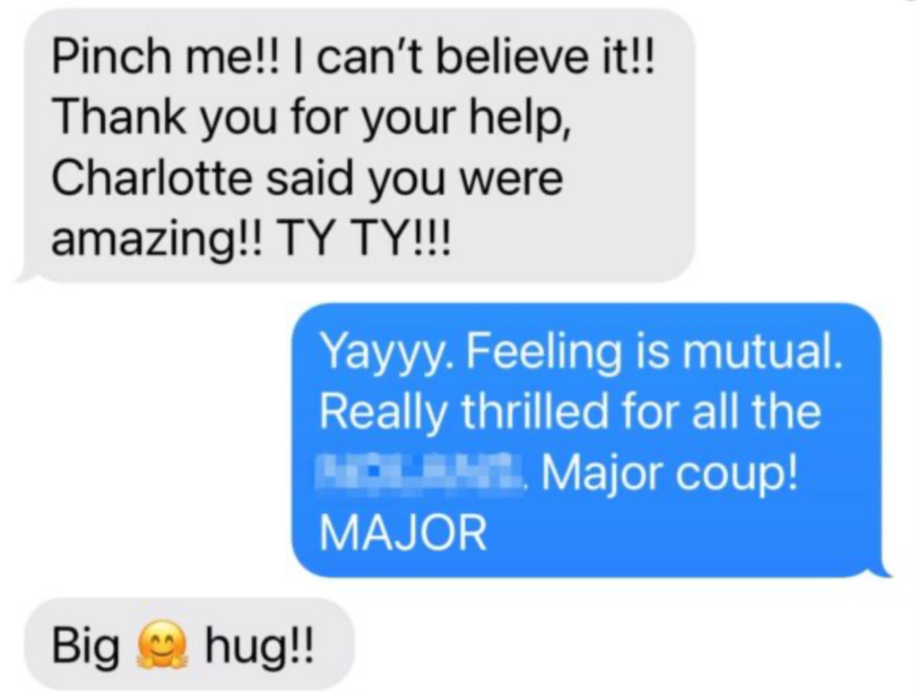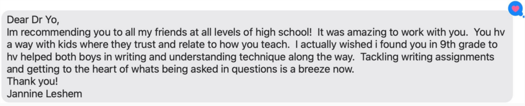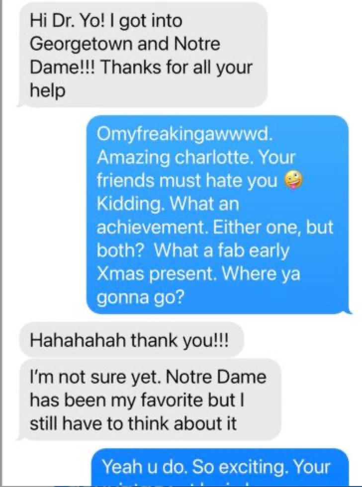 “Thank you! The essay is brilliant and the few tweaks are perfect. This past week was so amazing for many reasons. KTB adores you! And you have been able to connect with her in a way that has completely inspired her. She is so excited for her future and has taken everything you have guided her to heart. What’s even more important is that she has acted on your suggestions and has risen to every challenge- growing and expanding in every way. We are so grateful and can not thank you enough! Excelsior!”